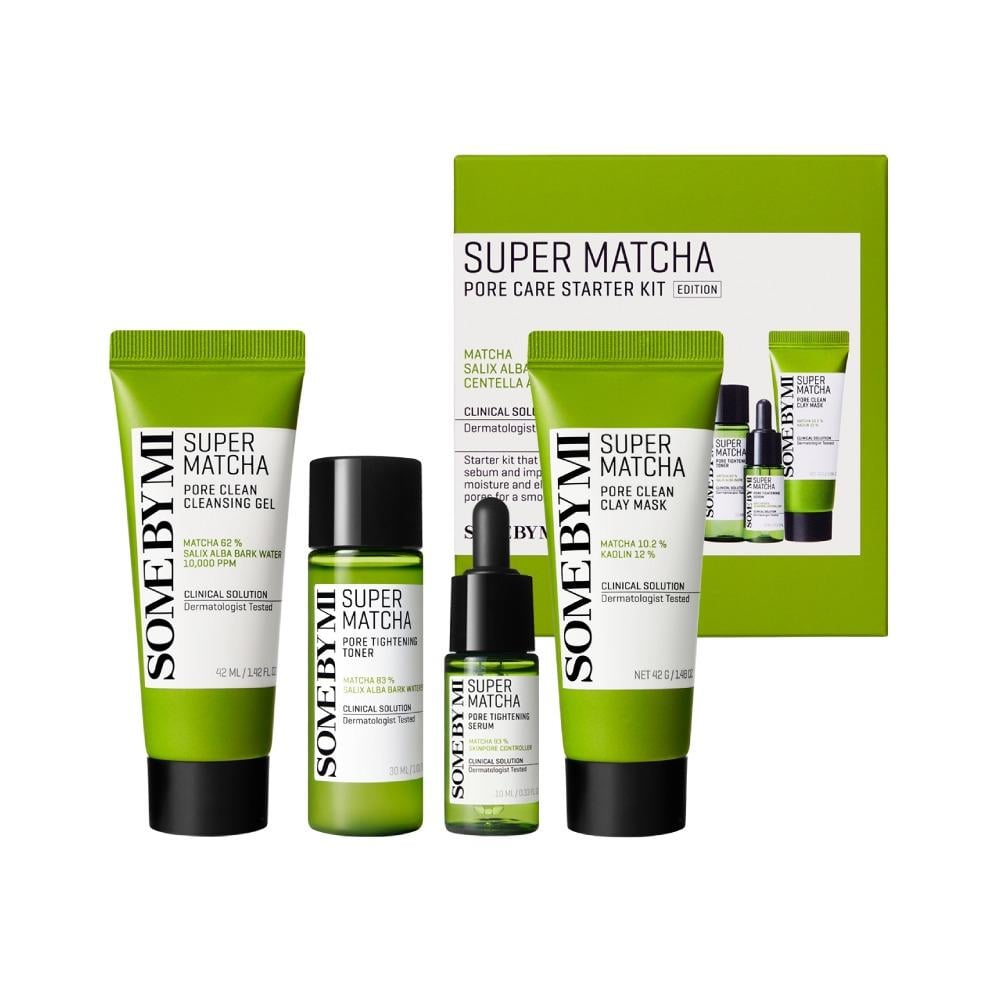 مجموعة مكونة من أربع منتجات بأحجام تجريبية من مجموعة الماتشا الخارقة للعناية بمشاكل المسام المتعددة بما فيها الرؤوس السوداء والبيضاء، والمسام الواسعة والتخلص من ترسبات الأوساخ والمكياج والدهون فيها.