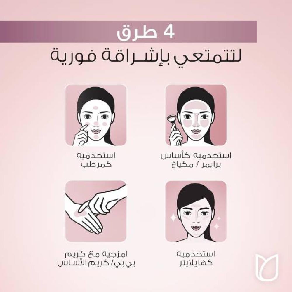 - متعدد الاستخدامات: يمكن استخدامه كمرطب، برايمر قبل المكياج، هايلايتر، أو مزجه مع كريم الأساس للحصول على إشراقة إضافية.