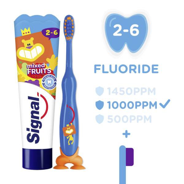 -قم بتنظيف أسنانه بلطف لمدة تصل إلى دقيقتين باستخدام فرشاة أسنان سيجنال ناعمة مخصصة للأطفال وكمية بحجم البازلاء من معجون الأسنان