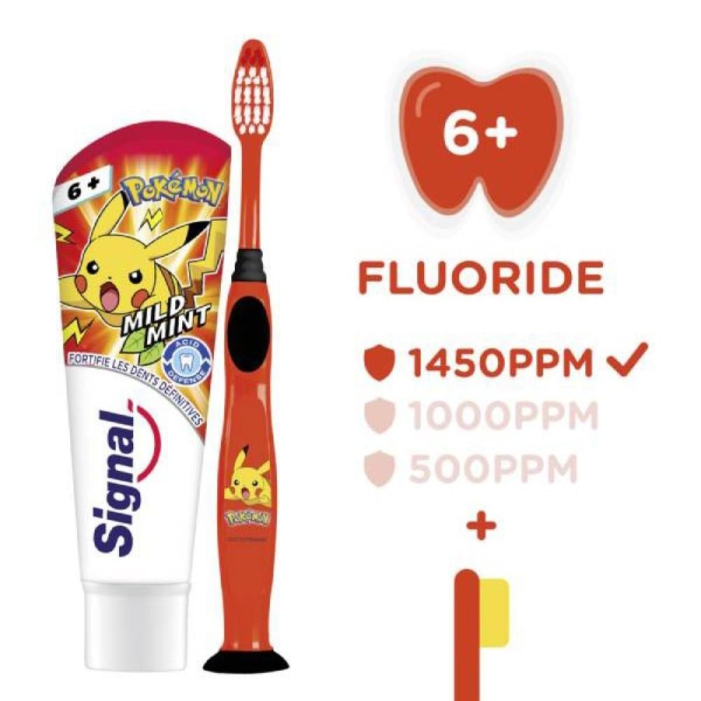 -قم بتنظيف أسنانه بلطف لمدة تصل إلى دقيقتين باستخدام فرشاة أسنان سيجنال ناعمة مخصصة للأطفال وكمية بحجم البازلاء من معجون الأسنان