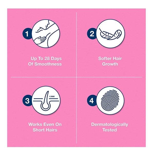تزيل كل الشعر من الجسم حتى أقصر الشعيرات و تقلل من سرعة ظهوره لمدة تصل الى أربعة أسابيع.
