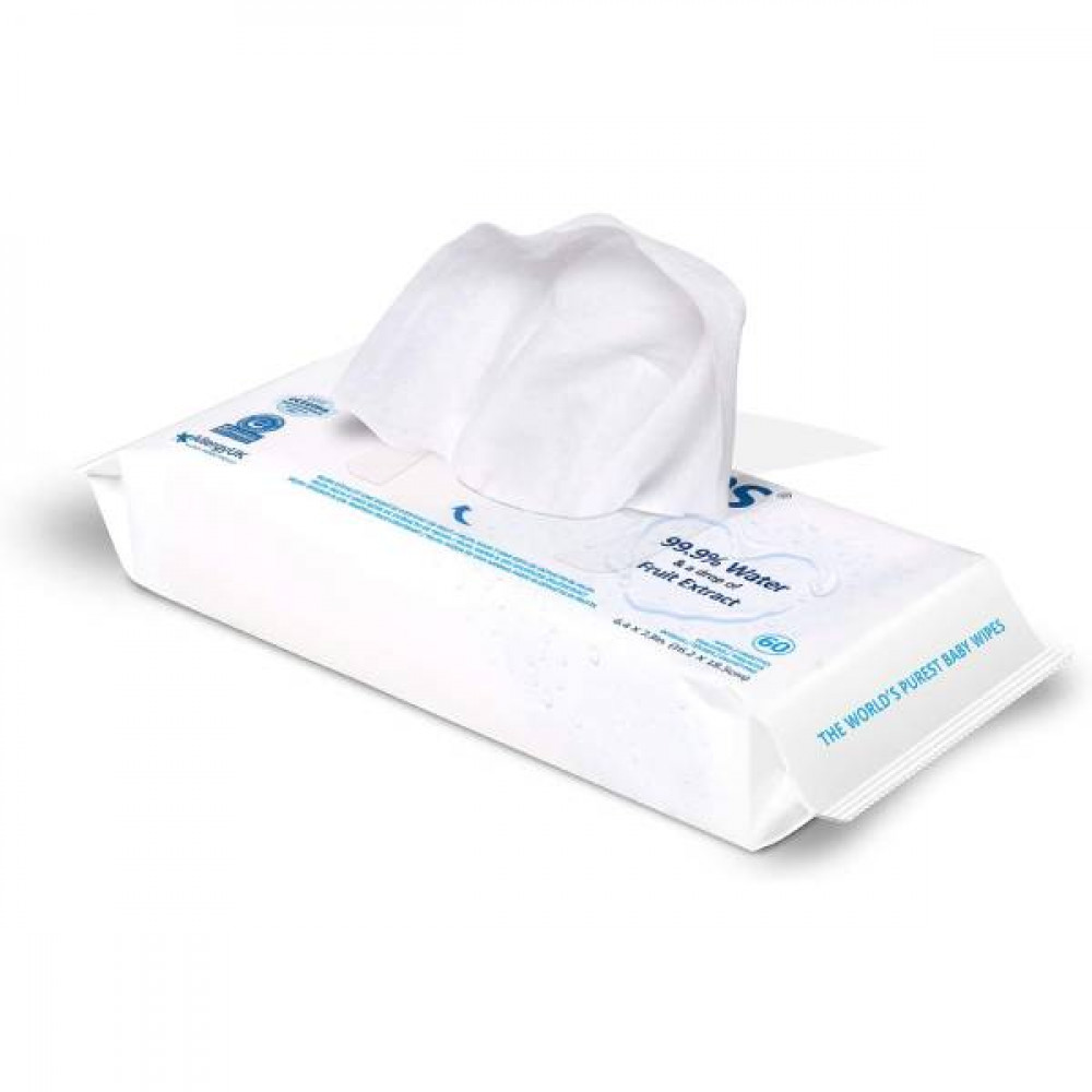 أنقى مناديل مبللة في العالم. 99.9% ماء نقي, 0.1% مستخلص فواكه.